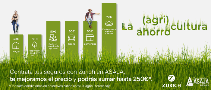 *El cliente recibirá un incentivo por nuevas contrataciones realizadas y con fecha de efecto (entrada en vigor) entre el 1 de febrero y el 31 de diciembre de 2025, ambos inclusive, para los siguientes seguros: 1) Coche (turismos o furgonetas de uso particular) con la modalidad de Todo Riesgo con franquicia o Terceros completo con tomador, conductor y/o propietario con al menos 5 años de carné. 2) Comercios. 3) Hogar. 4) Explotaciones agrícolas. 5) Daños a maquinaria agrícola. 6) Responsabilidad civil agraria. La devolución se hará mediante transferencia bancaria o a través de tarjeta visa virtuo si el pago se realiza con tarjeta bancaria en un plazo máximo de 90 días desde la fecha de efecto de la nueva póliza contratada. Importe máximo por tomador: 250 €, con independencia de las pólizas contratadas y de su modalidad. Los beneficios de mejora de precio e incentivo económico adicional son independientes entre sí, y cada uno de ellos tiene condiciones específicas que se recogen en colectivos.zurich.es/plus-agricultores. Estos productos pertenecen a Zurich Insurance Europe AG, sucursal en España. SERJA CONSULTORIA Y SERVICIOSAGRARIOS, S.L.(B-53929477) recomienda los productos de Zurich Insurance Europe AG. sobre la base del análisis objetivo previsto en la Ley de Mediación de seguros y reaseguros privados.