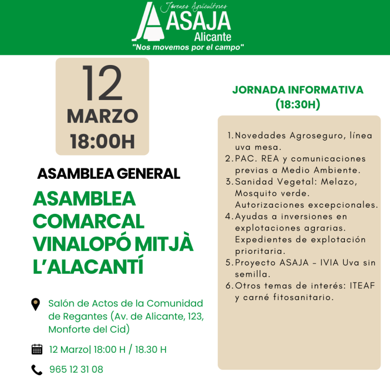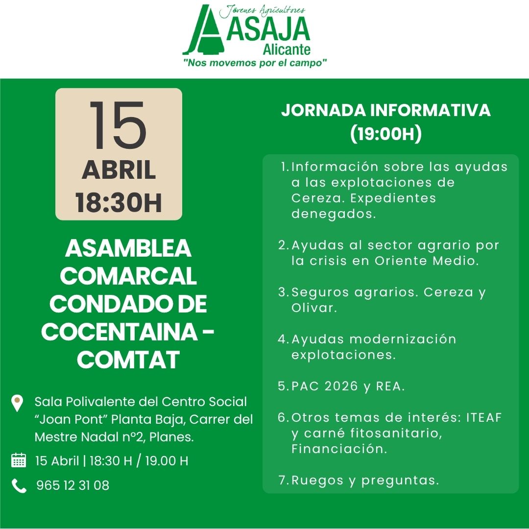 JÓVENES AGRICULTORES – ASAJA ALICANTE con N.I.F. G-03247152, domicilio social en C/ PINTOR LORENZO CASANOVA Nº62, 2ª PLANTA; C.P – 03003 – ALICANTE con número de teléfono 965-12.31.08 y e-mail: cristina@alicanteasaja.com es el responsable del tratamiento de sus datos de carácter personal. Por tanto, nosotros le garantizamos su seguridad y tratamiento confidencial, de conformidad con lo dispuesto en el REGLAMENTO EUROPEO DE PROTECCIÓN DE DATOS (UE) 679/2016, así como cualquier otra normativa que resulte de aplicación.
